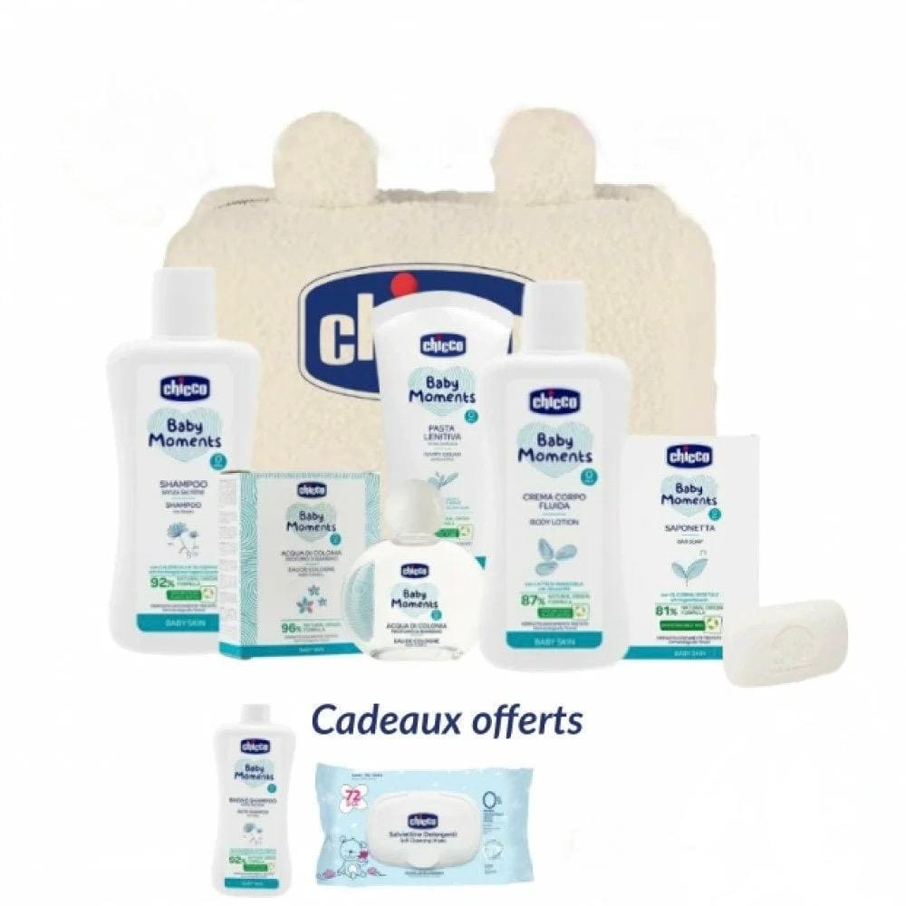 CHICCO TROUSSE BABY MOMENTS se compose de indispensables de bébé : idéal pour partir à la maternité, comme pour offrir en cadeau naissance !